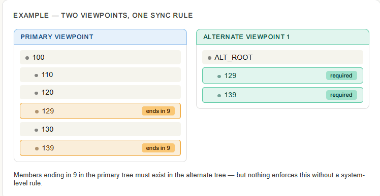 The challenge is keeping them in sync. When a new member gets added to the primary viewpoint, the right members need to appear in the right alternate viewpoints too. Left to manual processes, this breaks down quickly.